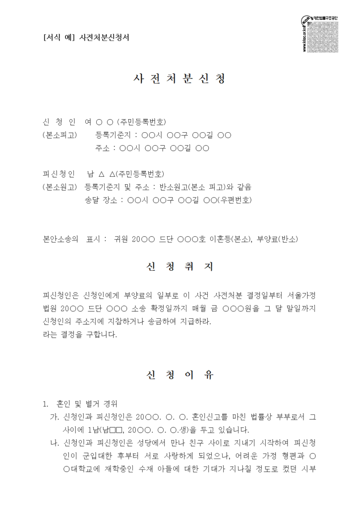 - 신청 시기: 본안 소송(이혼 소송)이 법원에 ‘접수된 이후’에만 신청 가능합니다.