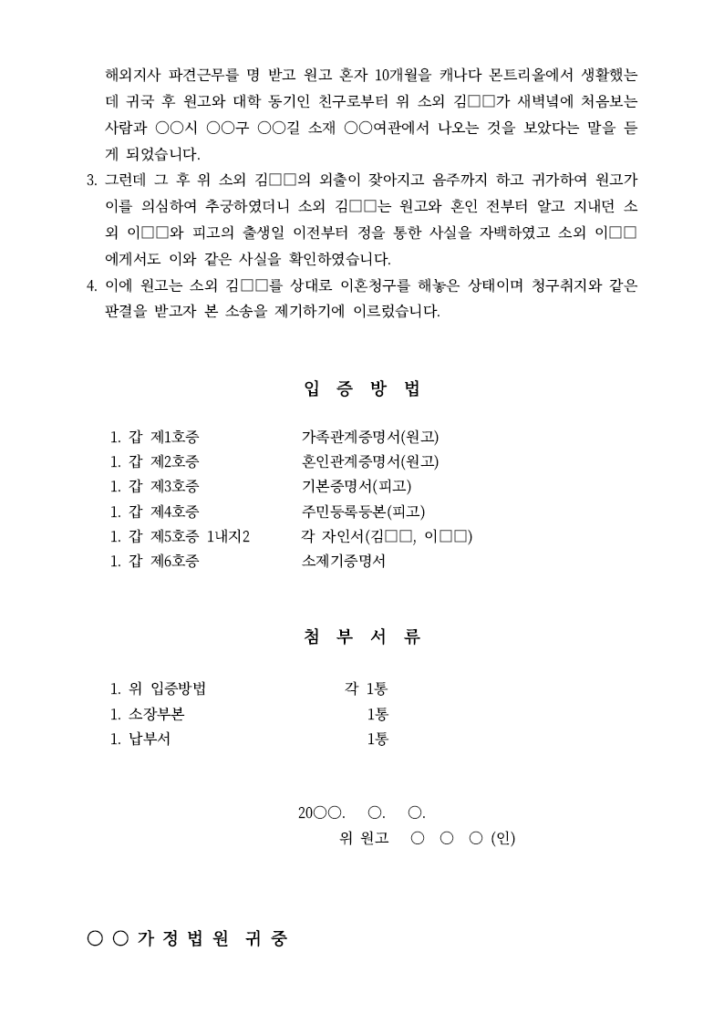 - 원고: 소를 제기하는 원고의 인적사항(주민번호, 등록기준지 포함)을 적으면 됩니다.