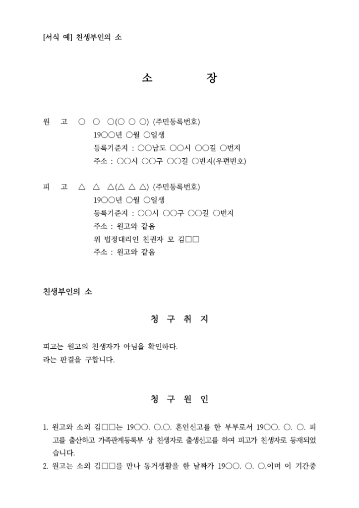 - 청구취지: 양식과 달리 자녀가 피고인 경우에는 ‘피고는 원고의 친생자임을 부인한다’, 배우자가 피고인 경우에는 ‘사건본인은 원고의 친생자임을 부인한다‘라고 적는 것이 좋습니다.